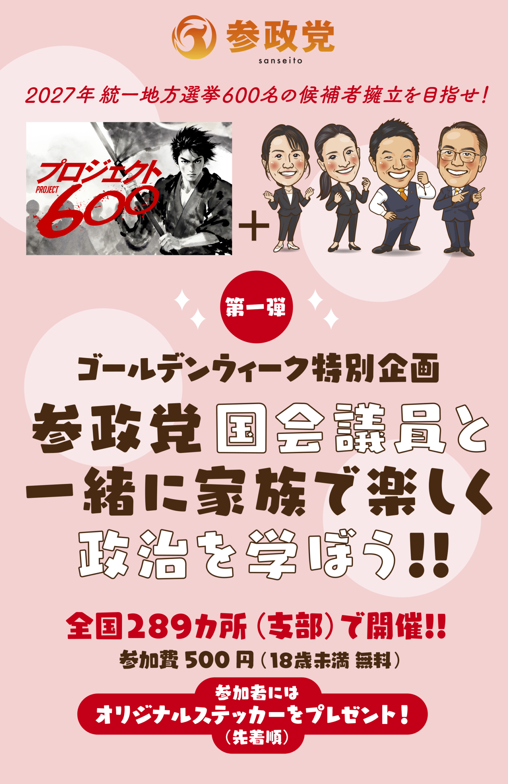 GW特別企画! 国政報告&候補者説明会 未分類 2026.04.26 GW期間中、参政党の国会議員が全国289か所で 「国政報告会&候補者説明会」を開催します。お近くの会場で、ぜひ直接お話をお聞きください。詳細は下記ページをご確認ください!! 参政党地方選挙公認候補募集企画 プロジェクト600 -PROJECT600-2027年統一地方選挙600名の候補者擁立を目指せ!全289か所(支部)で参政党国会議員30人が国政報告&候補者説明会を開催致します。 \ 最新情報をチェック / FacebookXBlueskyHatenaPocketCopy